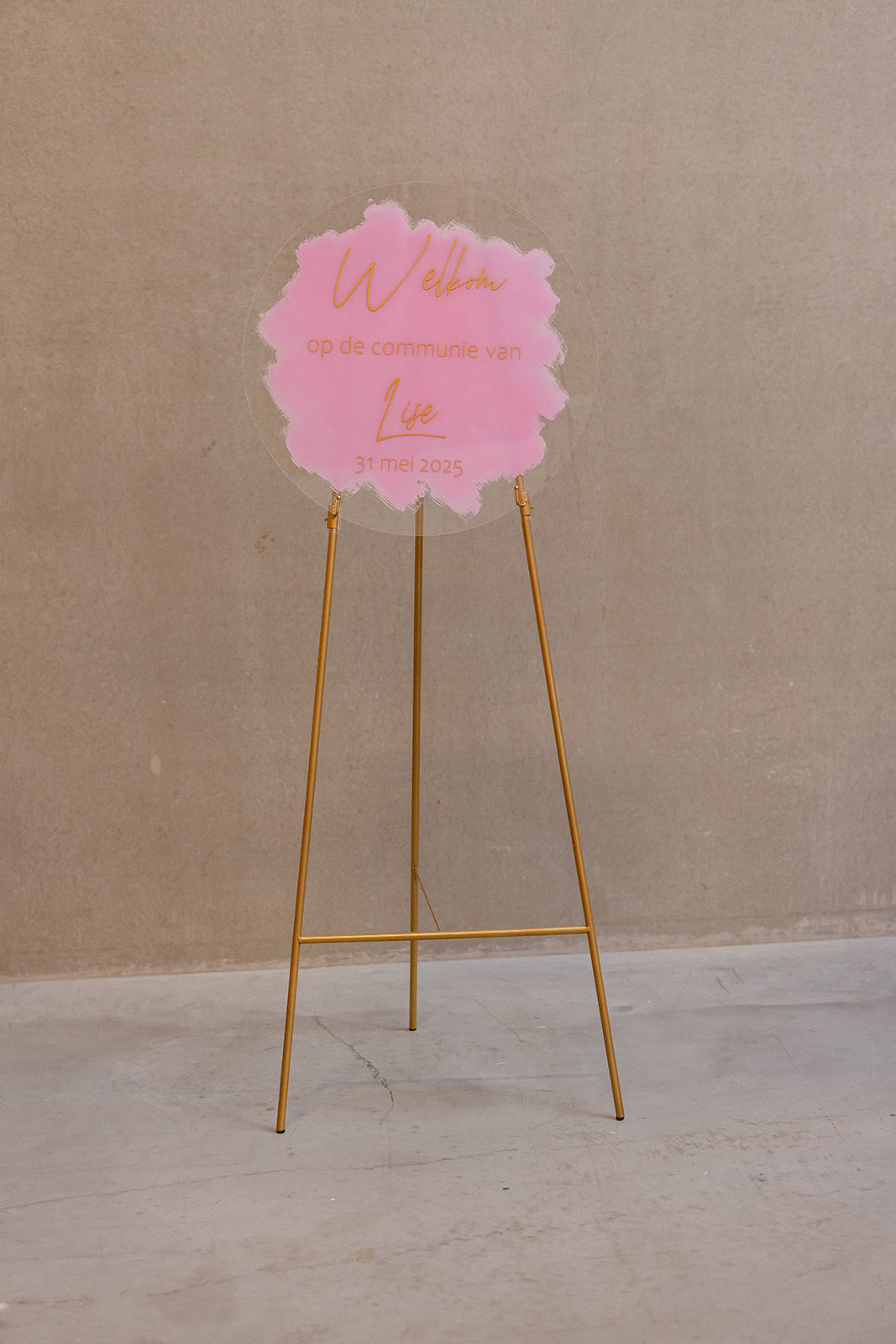 Afmetingen: Rond acryl bord met een diameter van 60cm, ideaal voor het verwelkomen van gasten bij de ingang of als opvallende decoratie op je evenement